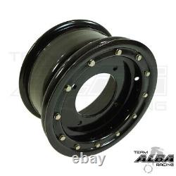 Rear "H" Lugs w/ mud shovels. The rear lugs have our proprietary H lugs with "Mud Shovels". The 45 degree edge of the lug helps release the mud every rotation allowing the sharp 90 degree edge to take a fresh bite! Side traction lugs on both front and rear. Both tires have side lugs that give you traction where other tires do not! In ruts and corners you are often running on the sidewall, why would you not want max traction? 1 pair (2) rear tires with Black Bead lock wheels with a Black ring. 1 pair (2) Front tires with Black Bead lock wheels with a Black ring. FRONT Wheels fit most sport ATV's with bolt pattern 4/144 and 4/156. REAR Wheels fit most sport ATV's with bolt pattern 4/115 and 4/110. Front 10x5 4+1 Off Set. Rear 9x8 3+5 Off Set.